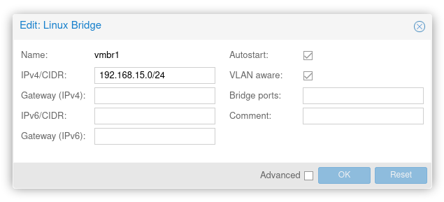 192.168.15.0/24 is the range this "gateway" will serve to other virtual machines & containers. By already setting this here, you'll still be able to actually connect to these machines from the Proxmox host, and thus configure some port forwarding.