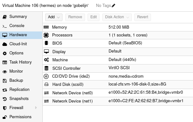deb.debian.org mirror, because it blocks VPN connections.Don't forget to add both network bridges to it. Once you're done, it's hardware setup should look like this: